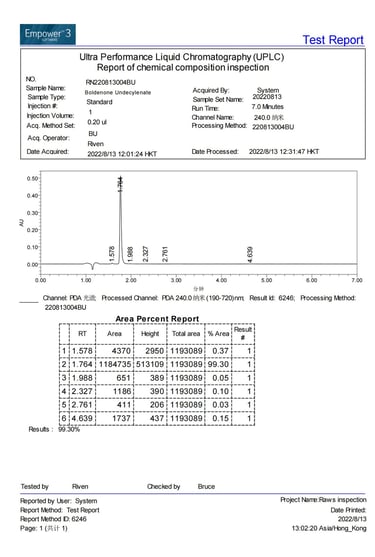 Side effects of boldenone undecylenate include symptoms of masculinization like acne, increased hair growth, voice changes, and increased sexual desire. The drug is a synthetic androgen and anabolic steroid and hence is an agonist of the androgen receptor (AR), the biological target of androgens like testosterone and dihydrotestosterone (DHT). It has strong anabolic effects and moderate androgenic effects, weak estrogenic effects, and no risk of liver damage. Boldenone undecylenate is an androgen ester and a long-lasting prodrug of boldenone in the body.