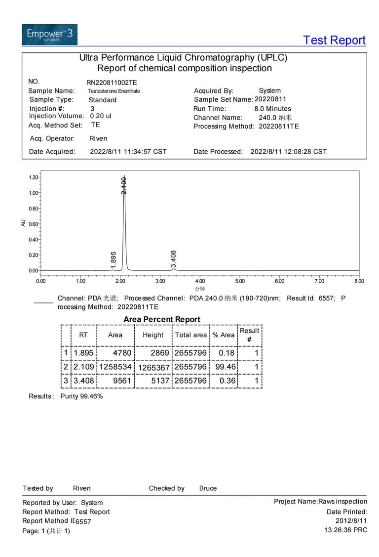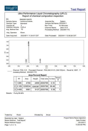Side effects of testosterone enanthate include symptoms of masculinization like acne, increased hair growth, voice changes, and increased sexual desire.[4] The drug is a synthetic androgen and anabolic steroid and hence is an agonist of the androgen receptor (AR), the biological target of androgens like testosterone and dihydrotestosterone (DHT). It has strong androgenic effects and moderate anabolic effects, which make it useful for producing masculinization and suitable for androgen replacement therapy. Testosterone enanthate is a testosterone ester and a long-lasting prodrug of testosterone in the body. Because of this, it is considered to be a natural and bioidentical form of testosterone.
