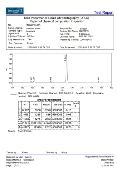 Trenbolone acetate was never approved for use in humans and therefore guidelines for human consumption do not exist.[ However, athletes and bodybuilders have been using trenbolone acetate as a physique- and performance-enhancing drug for decades. There are a large number of benefits as a bodybuilder through using trenbolone acetate as an AAS. Unlike testosterone, trenbolone acetate does not cause any fluid retention while gaining muscle mass. This allows bodybuilders to appear leaner, and this is why it is more commonly used whilst preparing for competitive events. Trenbolone acetate does not convert into an estrogenic metabolite, and this results in a lack of estrogenic side effects. Trenbolone enanthate is also a very commonly used AAS and lasts much longer than trenbolone acetate with intramuscular injection.